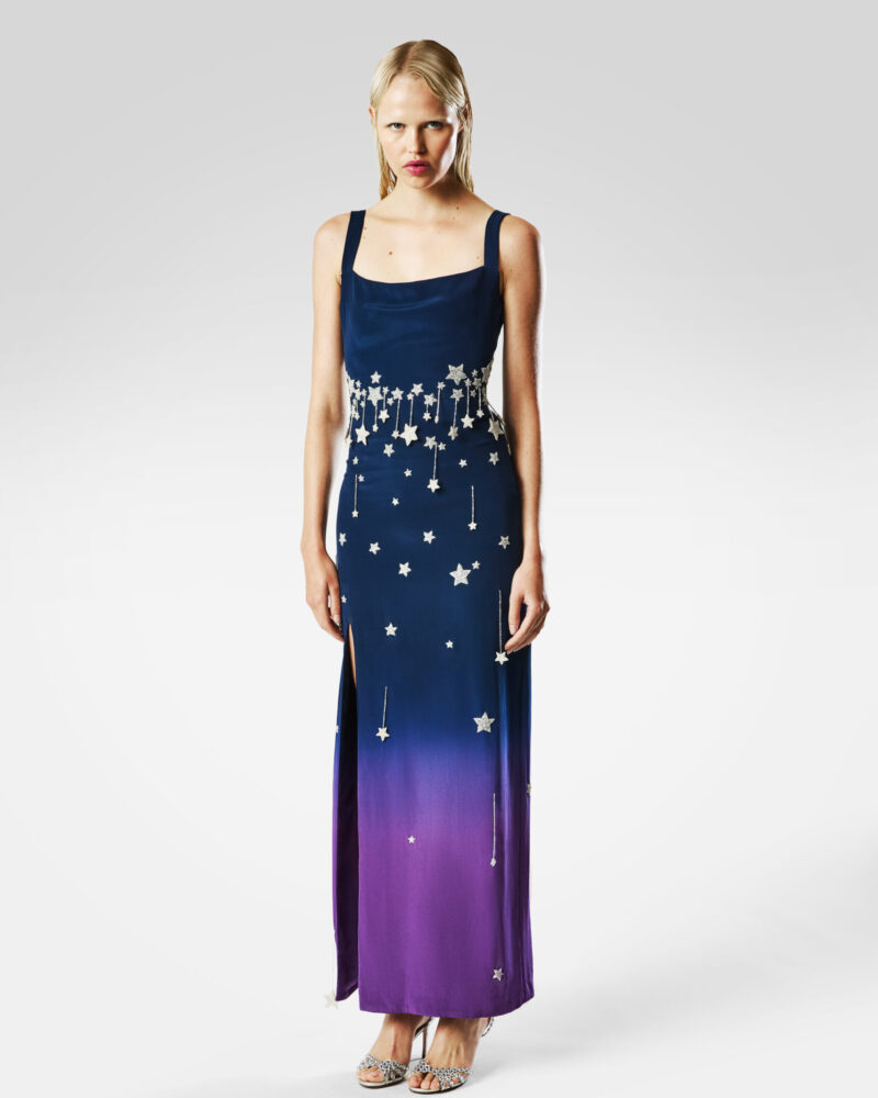 A night full of wishes, the Midnight Sky Gown drapes in deep navy melting into violet twilight. Silver stars scatter across the silhouette, some trailing like falling constellations, while a daring slit adds celestial allure. It’s elegance woven with stardust – a gown made for dreamers who dance beneath the cosmos.