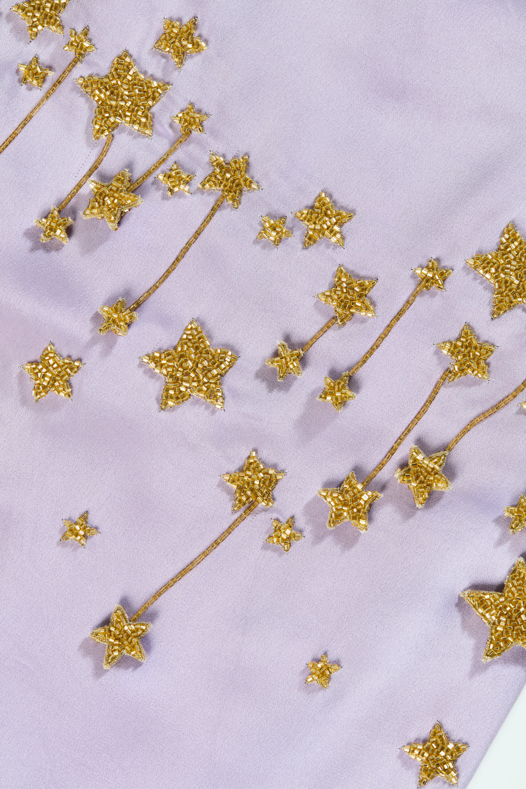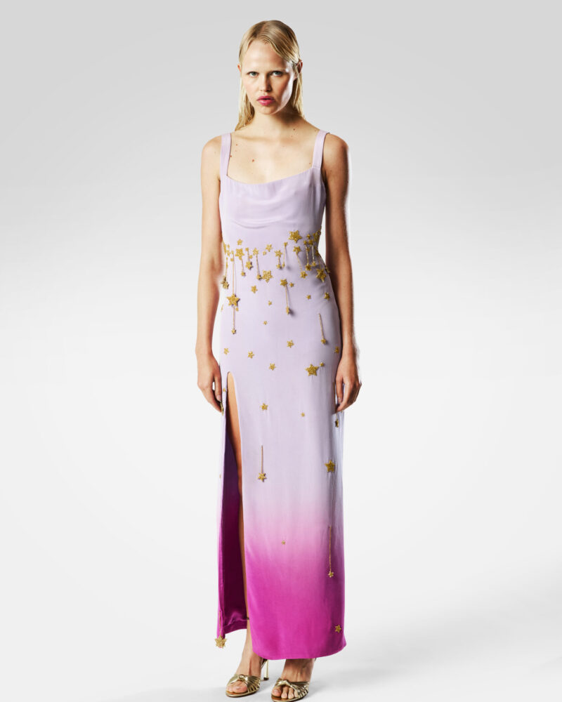 Soft as twilight, the Sunrise Gown glows in a lavender-to-rose ombré kissed with golden constellations. Stars tumble playfully down the waist and skirt, while a high slit adds a touch of daring. A gown spun from morning light, made for those who like to carry a little magic with them.