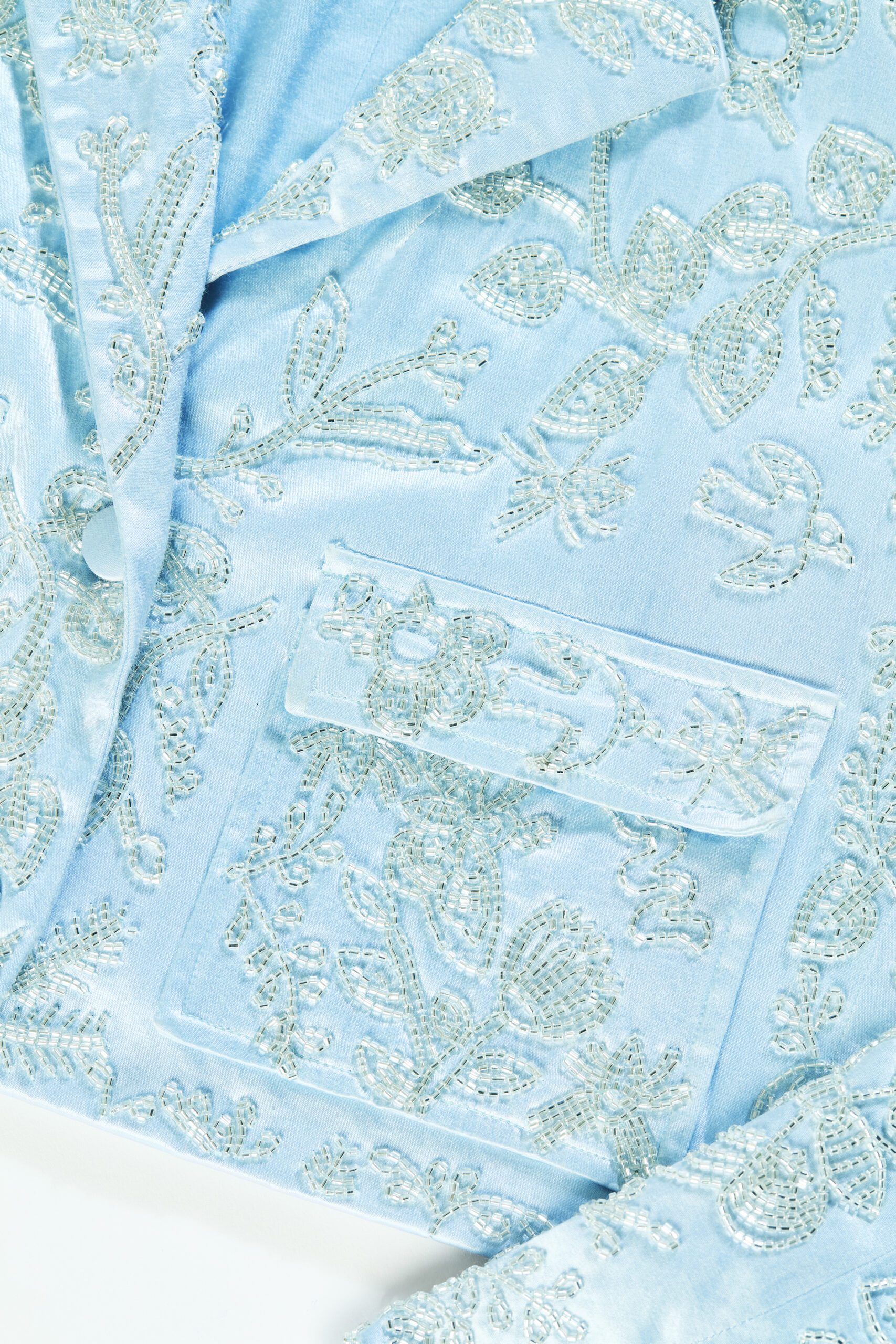 Command attention in The Business Suit – a bold reimagining of power dressing. Featuring a cropped embroidered jacket, sleek matching top, and a mini skirt, this set blends authority with seduction. The feminine powder blue and silver detailing exudes opulence, making it the ultimate look for women who own every room they walk into.