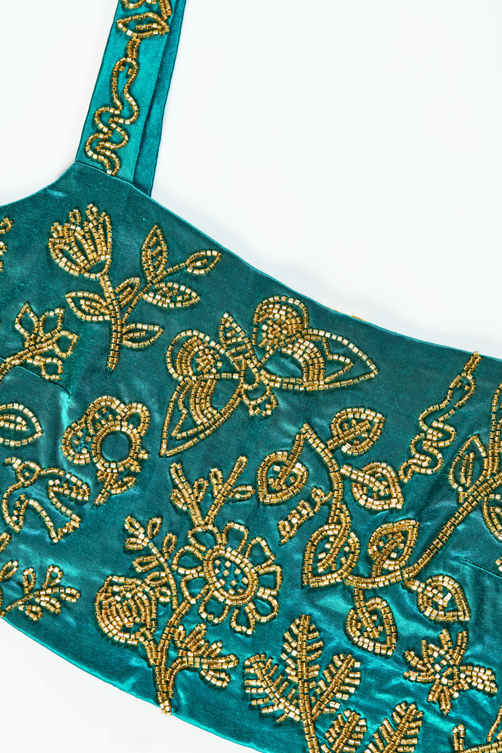 Command attention in The Business Suit – a bold reimagining of power dressing. Featuring a cropped embroidered jacket, sleek matching top, and a mini skirt, this set blends authority with seduction. The vibrant teal and gold detailing exudes opulence, making it the ultimate look for women who own every room they walk into.