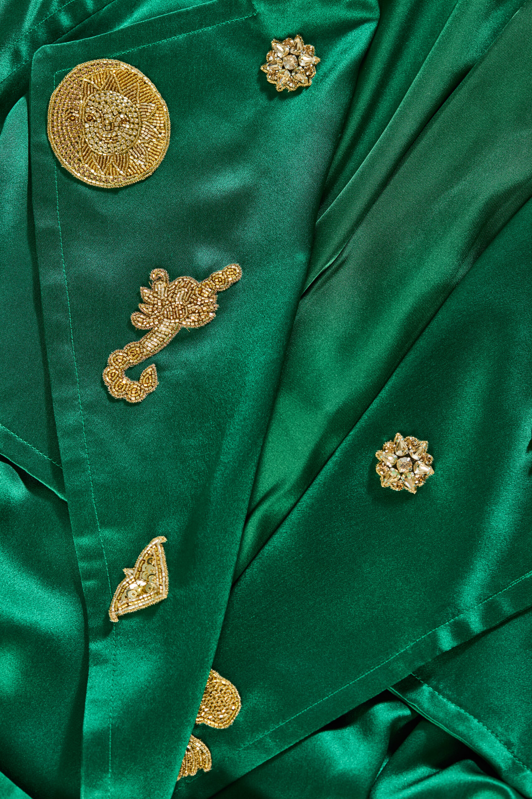 Mystical and regal, The Green Oracle Trenchcoat captures power through elegance. Cut in deep emerald 100% mulberry silk and embroidered with radiant golden symbols, this belted silhouette speaks of wisdom and strength. Flowing with quiet confidence, it’s a piece that transforms presence into prophecy.