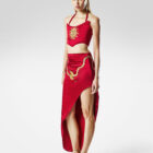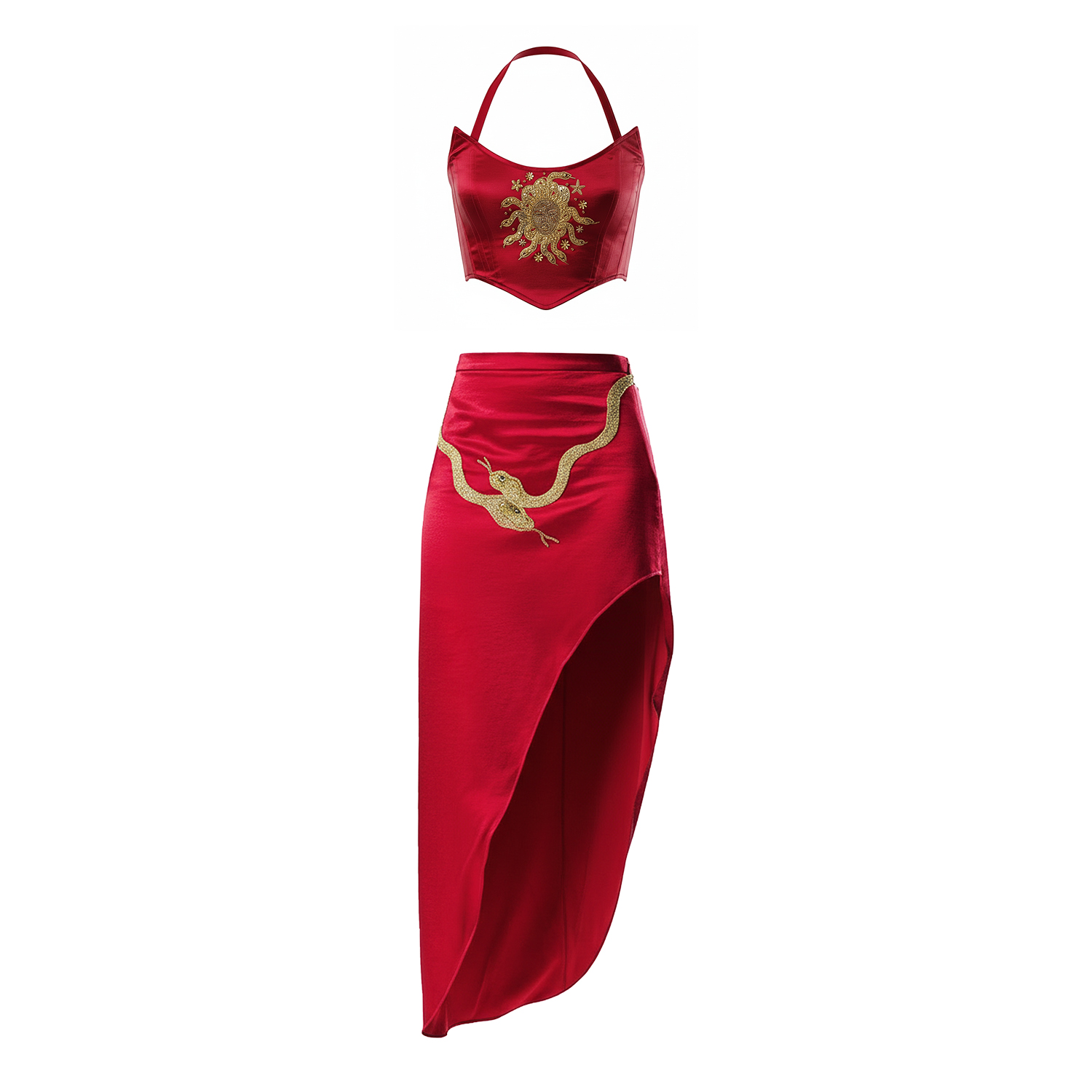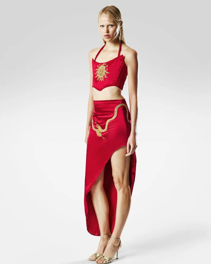 Inspired by the mythic goddess, The Medusa Set exudes danger and allure. A satin corset halter crowned with gold and a serpent-trimmed slit satin skirt embody power, transformation, and irresistible magnetism.