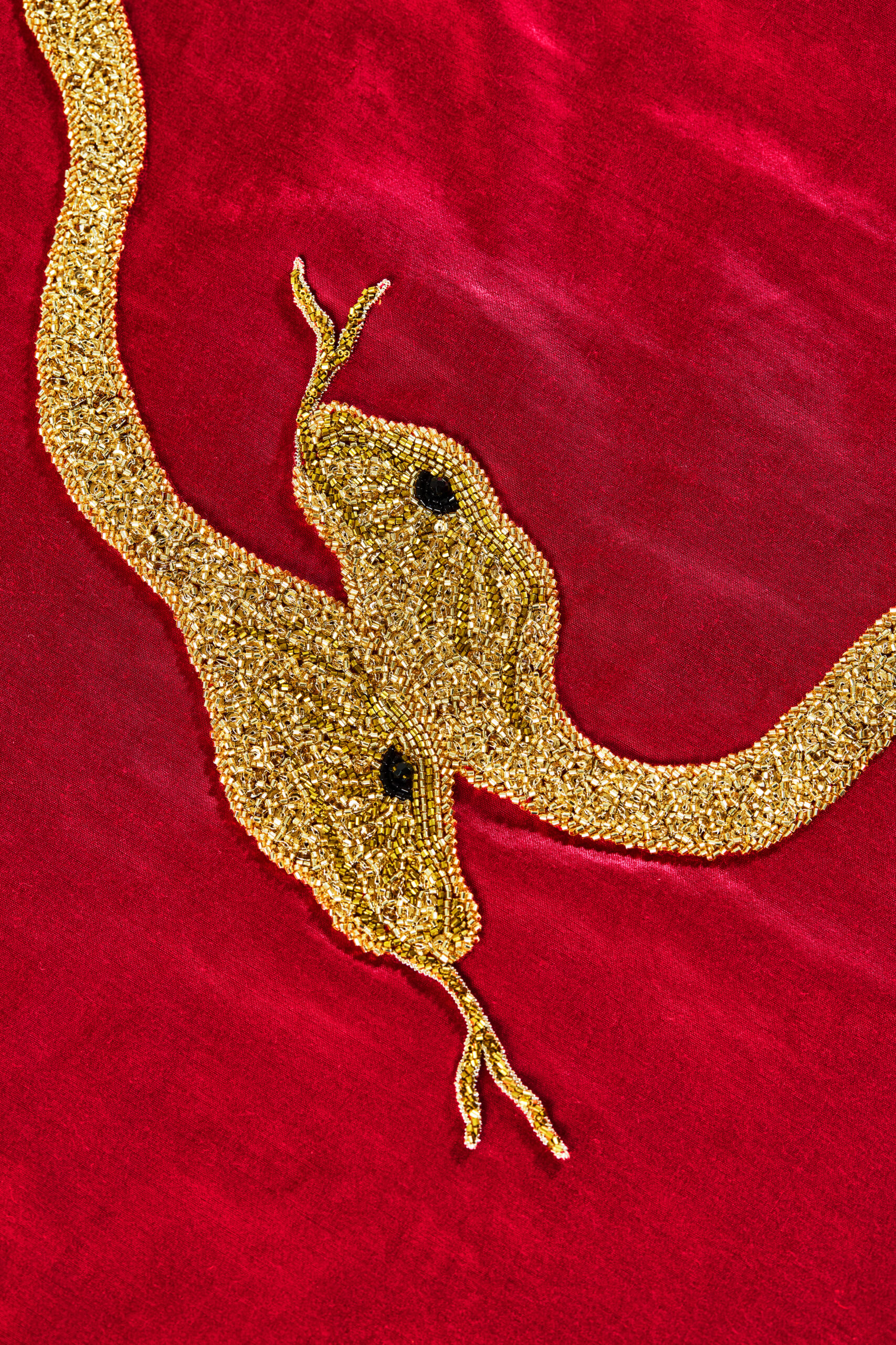 Inspired by the mythic goddess, The Medusa Set exudes danger and allure. A satin corset halter crowned with gold and a serpent-trimmed slit satin skirt embody power, transformation, and irresistible magnetism.