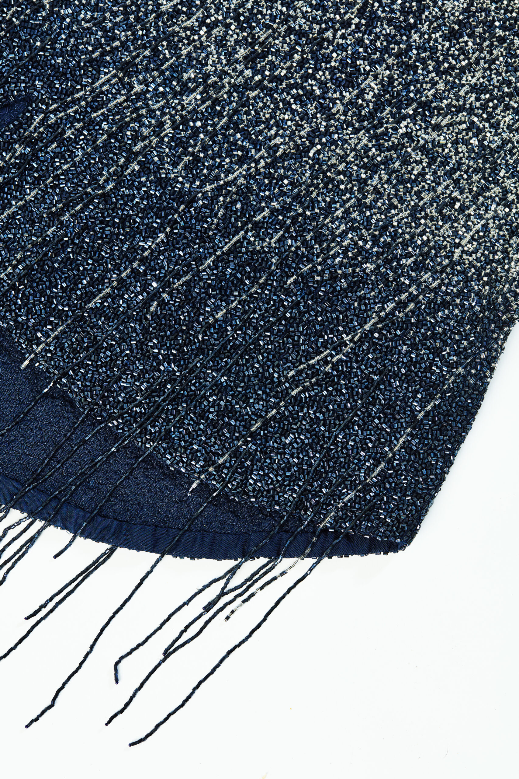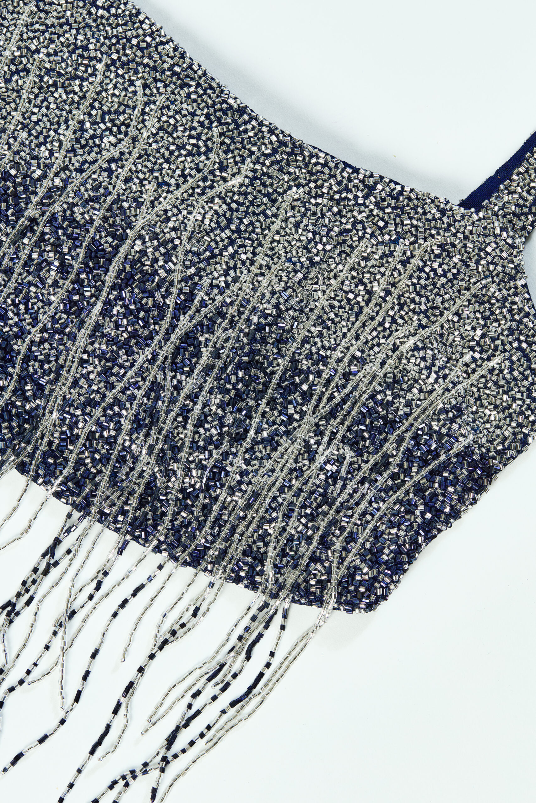 Like a meteor shower come to life, the Starfall Set glimmers in midnight blue with cascading silver fringe that shimmers with every move. The cropped top and mini skirt catch the light from every angle, while the matching beaded bag completes the celestial fantasy. A set made for nights that feel written in the stars.